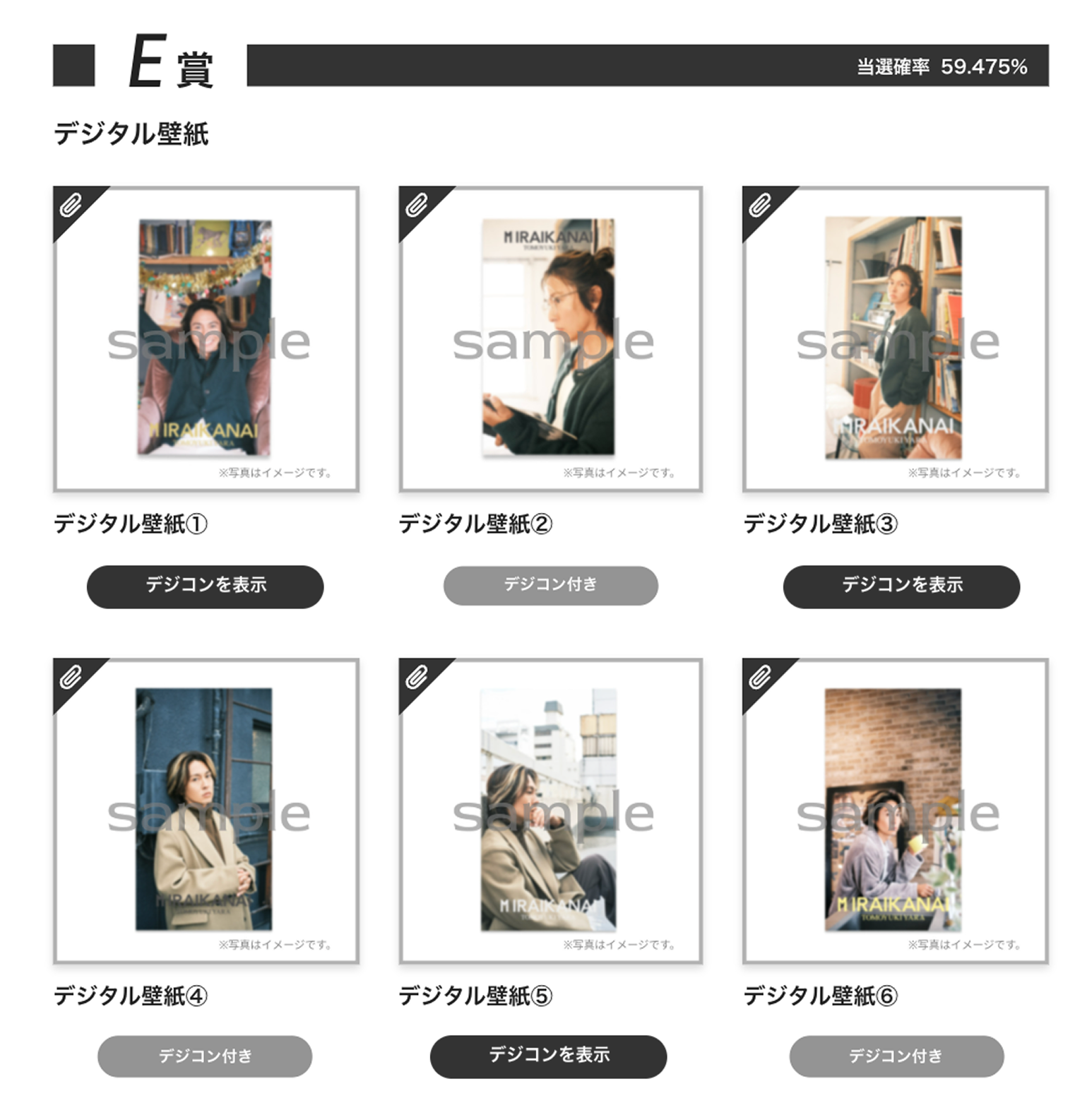 当選したデジタル壁紙は、抽選結果『デジコンを表示』、またはLINEUP一覧の該当賞品の画像下『デジコンを表示』からご覧いただけます。